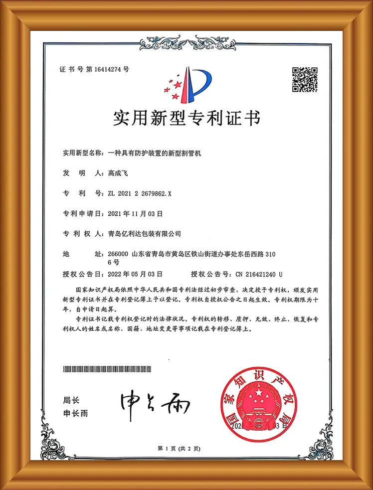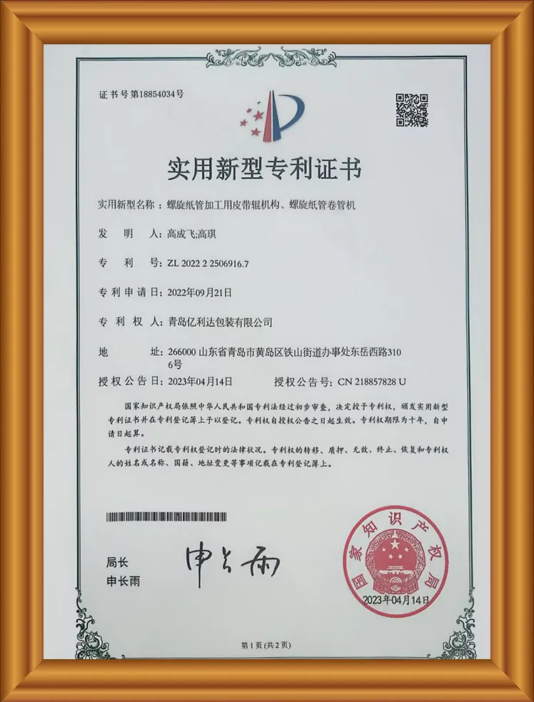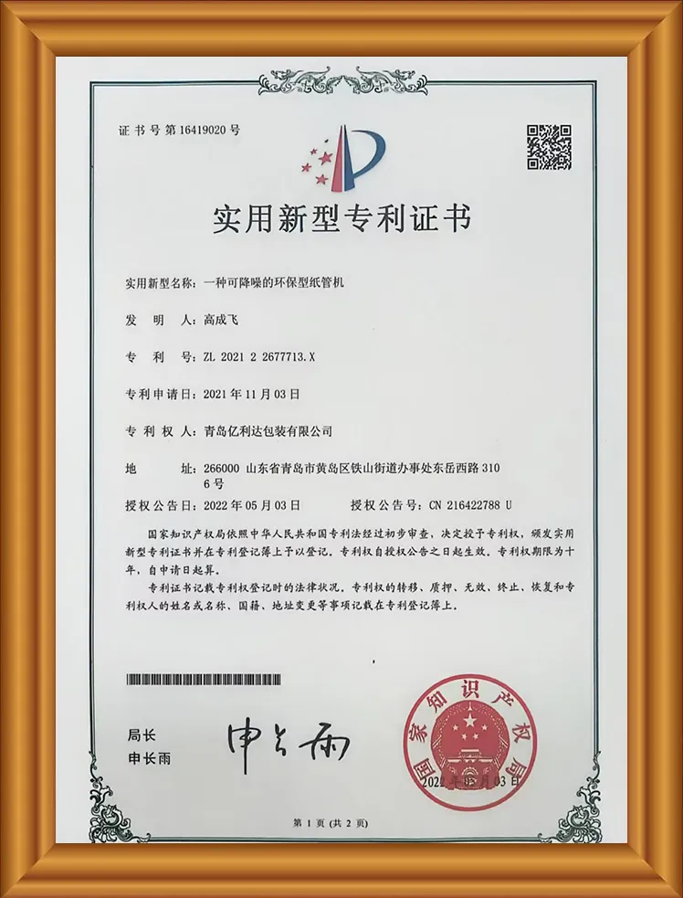 당사의 제품은 FSC 인증, ISO9001 인증을 받았으며 편리한 U자형 종이 튜브 기계, 전문적이고 혁신적인 중소기업 인증서, Puni 테스트 및 품질 공급업체 인증서를 포함하여 7개의 특허를 보유하고 있습니다.